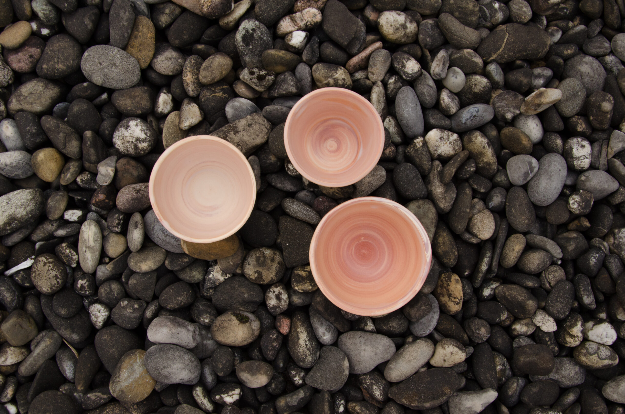 Drei gedrehte Tassen aus zwei vermischten Tonsorten.